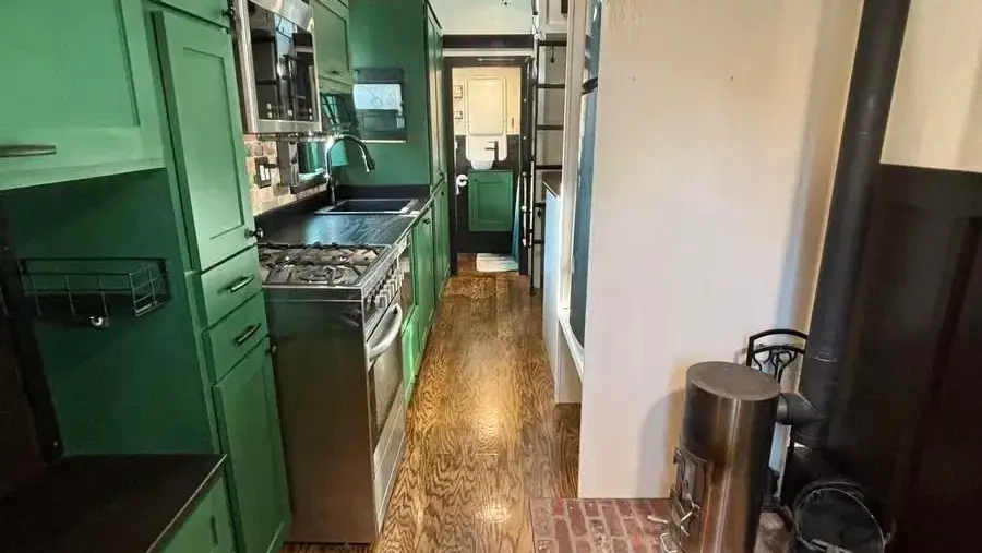 This unique tiny house is a beautiful cabin with custom cabinetry, ample storage, and beautiful woodworking paired with great functionality.